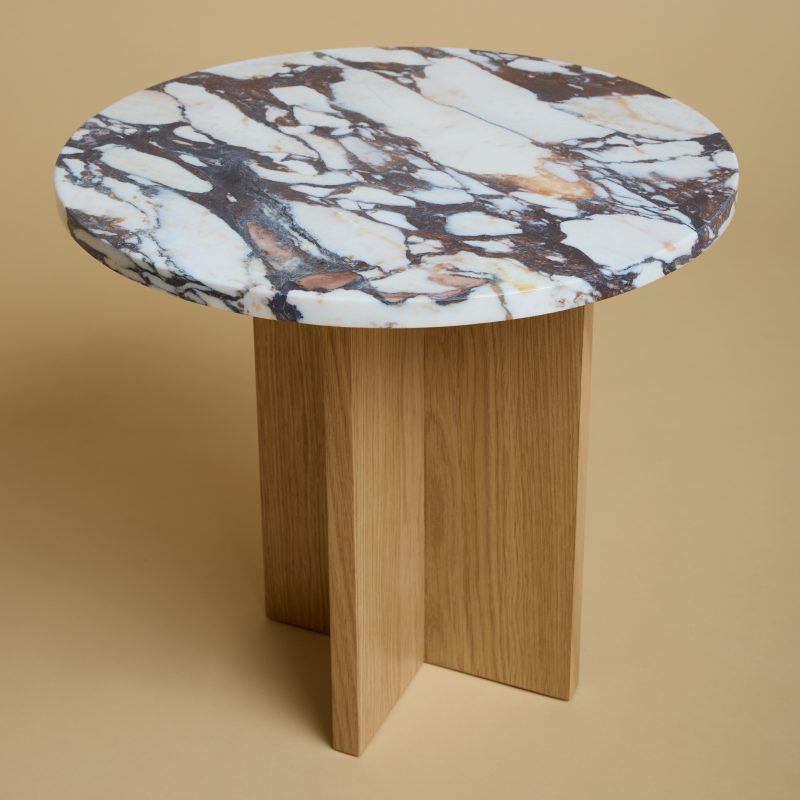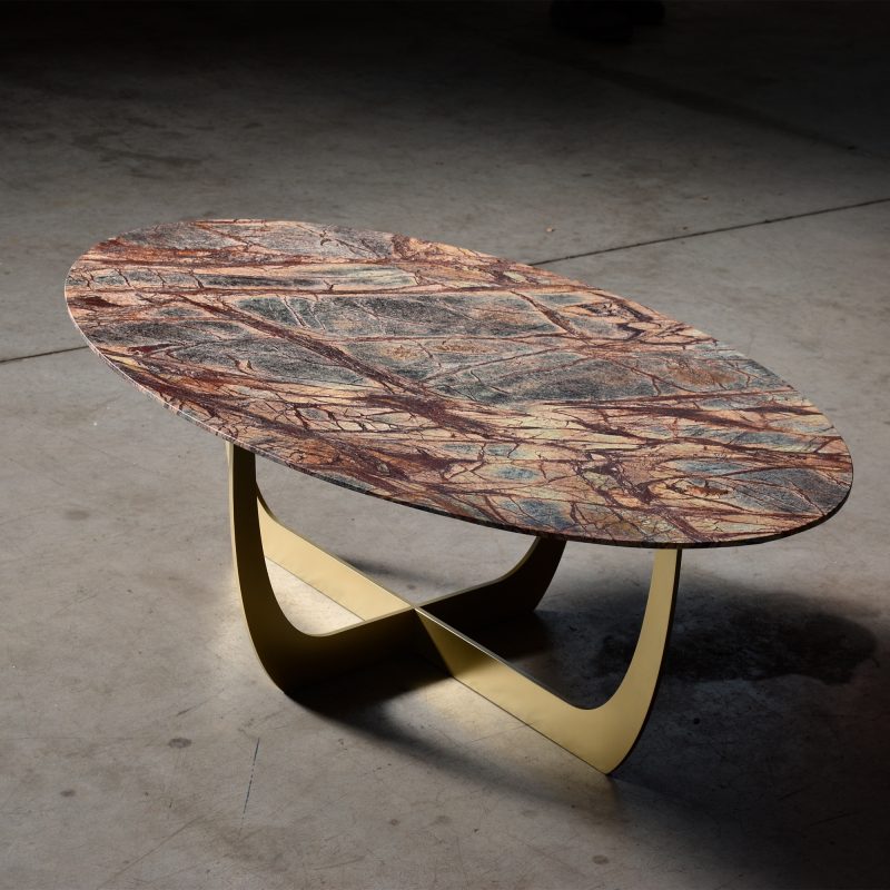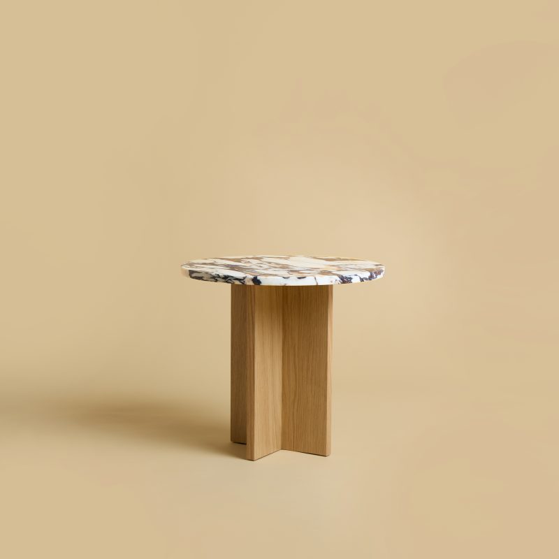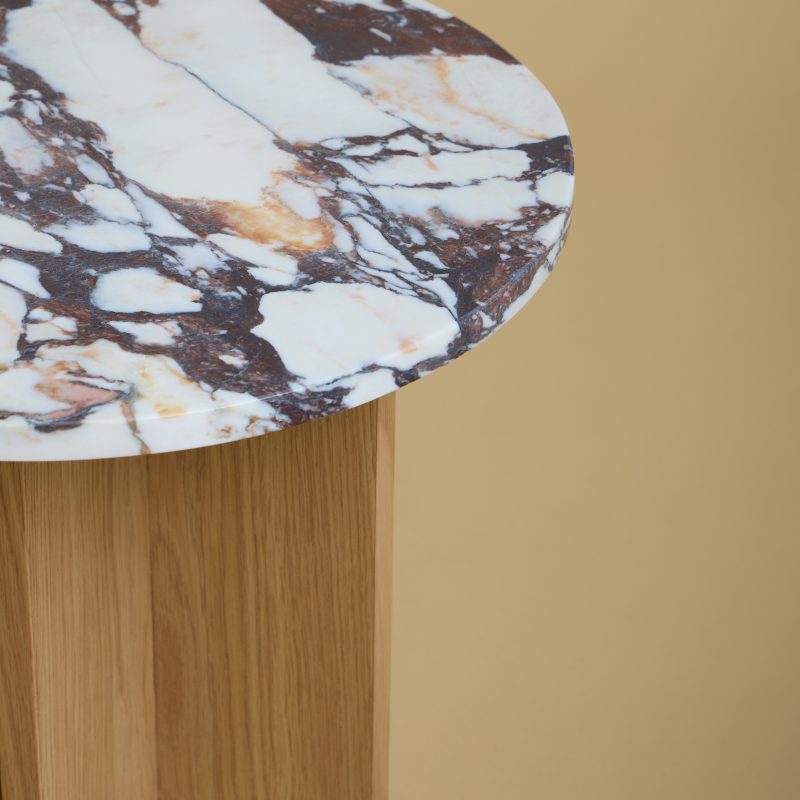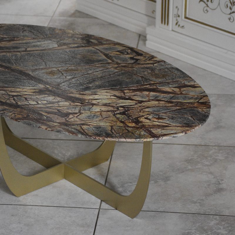 Yuvarlak formu, mekâna yumuşak bir geçiş sağlar. Doğal taşın canlı damarları, ahşap ayakların yalın tasarımıyla bir araya gelerek güçlü ama sade bir görünüm oluşturur. Detaya verilen önem, ürünü sadece mobilya değil bir sanat parçasına dönüştürür.